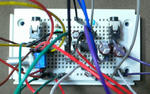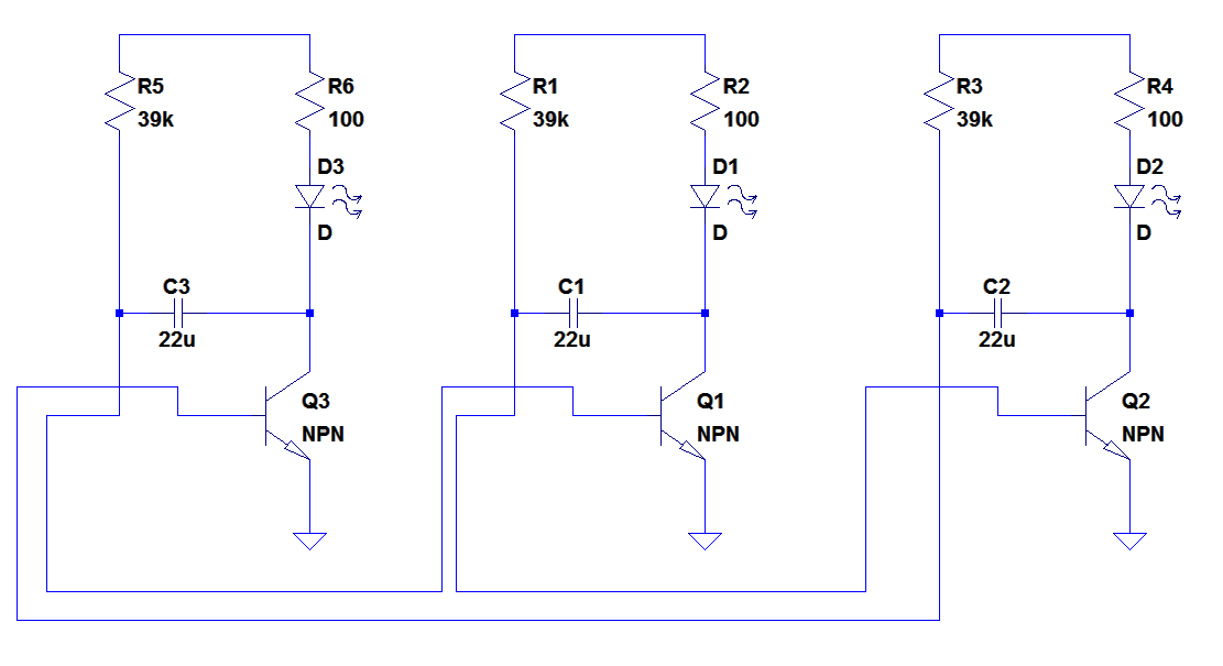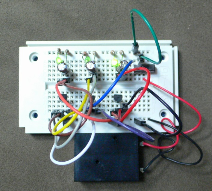 最初は3つのLEDが同時に発光してしまい、失敗かと思って何度も配線をやり直しました。しかしどうやらスイッチを入れるタイミングやコンデンサに残った電荷などの条件で動いたり動かなかったりするようです。何度もスイッチを入れたりしているときに動くようになりました。