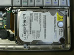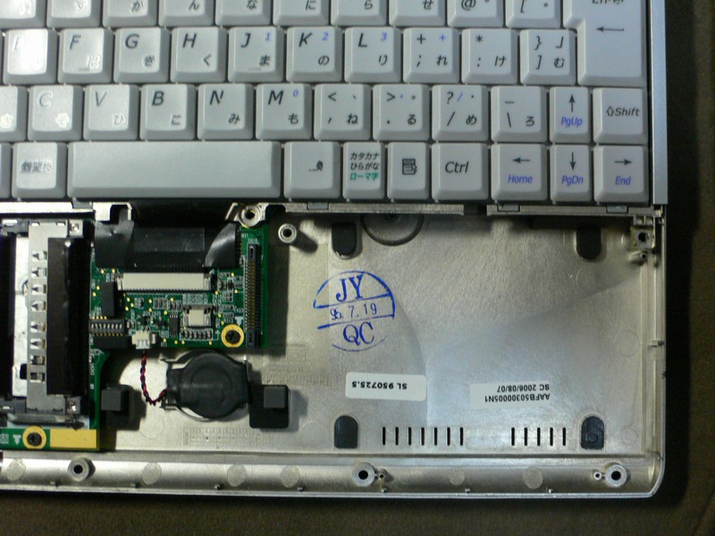 VersaproにHDDを入れます。まず画像の手前側の4本のビスと、中央のビス、両端のビスの計7本のビスを外してパームレストを外します。自分が手に入れた個体は軸受けが壊れていたので、外すのは6本でした。