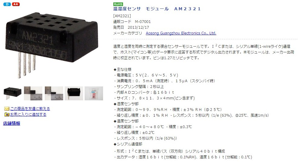 これは秋月で売ってる温湿度センサで入手性が良いのがポイントです。\700くらいですね。